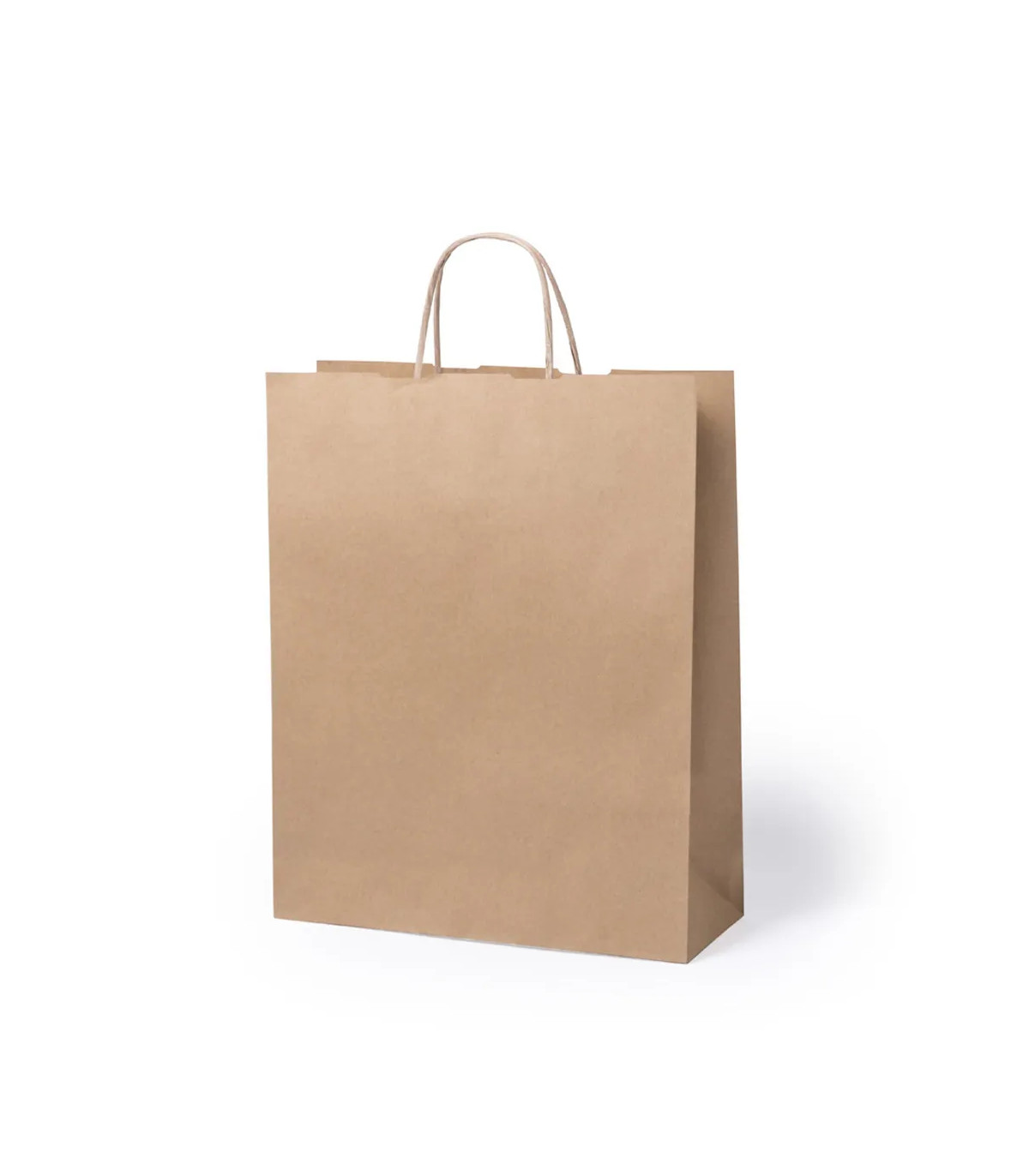Bolsa en papel de acabado natural de 100g/m2 con asas cortas reforzadas y fuelle. Resistencia hasta 7kg de peso.