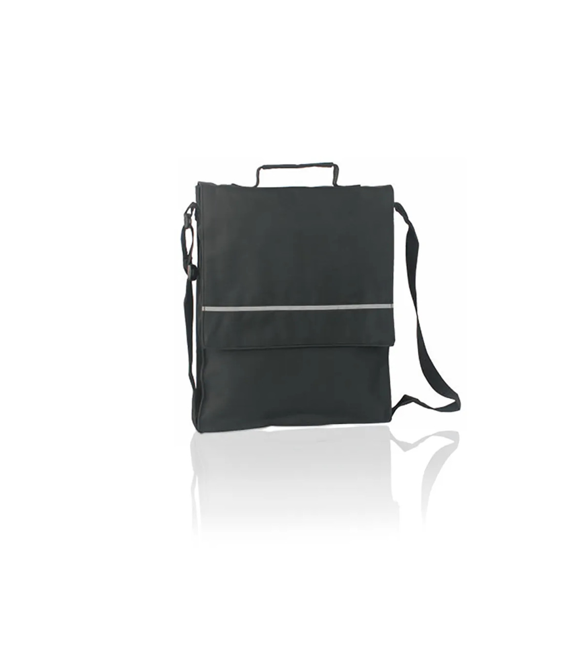 Portadocumentos con solapa de cierre de velcro en poliéster 600D de vivos colores y con franja frontal reflectante. Con asas reforzada a juego, cinta bandolera ajustable y compartimentos interiores con fundas para bolígrafos y smartphone.