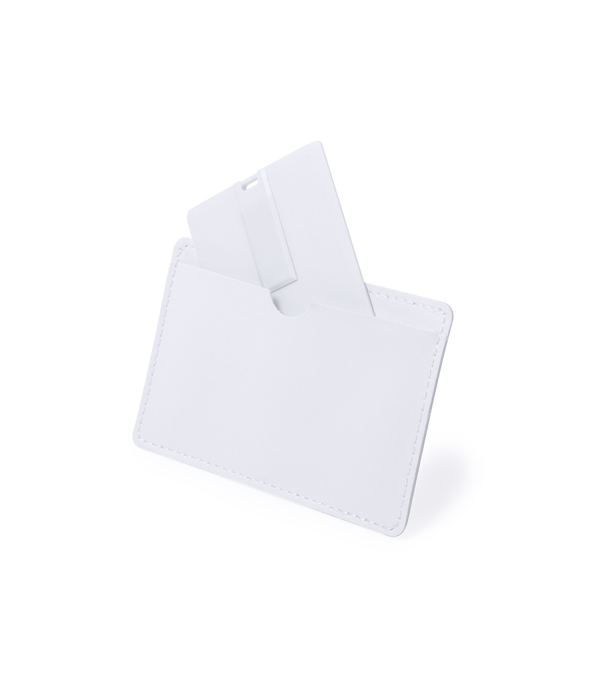 Memoria USB tarjeta de 16GB de capacidad. De diseño ultraplano, mecanismo plegable y especialmente diseñada para marcaje a todo color en digital. Presentada en elegante funda individual de polipiel blanca.